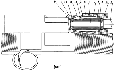 Передняя часть 10 сопрягается с внутренним конусом, выполненным в отверстии 8 наконечника 5. Задняя часть 9 и передняя часть 10 могут быть выполнены в форме усеченного конуса 12 (фиг.1) или радиусной поверхности 13 (фиг.2). Устройство 14, предохраняющее ствол от поворота, выполнено в виде выступа 15 в ствольной коробке 1, который взаимодействует с пазом 16 на входной части 4 ствола 3.