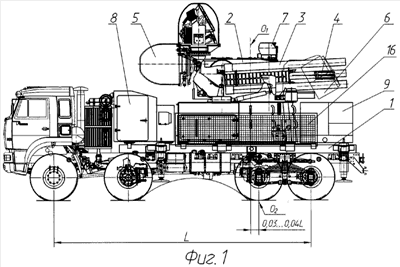 Зенитный комплекс состоит из шасси 1, на которых установлен боевой модуль 2. На боевом модуле по левому и правому борту размещены пусковые установки с контейнерами 3 для ракет и автоматические пушки 4. В кормовой части боевого модуля установлена станция обнаружения цели (СОЦ) 5. В носовой части между пушками размещена станция сопровождения цели (ССЦ) 6. На крыше башни боевого модуля установлен оптический пост 7. Между кабиной шасси и боевым модулем расположен модуль управления 8, а в кормовой части шасси – модуль электропитания 9. Шасси зенитного комплекса выполнены на базе 4-осного автомобиля «КАМАЗ», который обладает повышенной проходимостью благодаря всем ведущим осям и хорошо зарекомендовал себя при эксплуатации в условиях жаркого климата песчаных пустынь. Вертикальная ось вращения боевого модуля O1 расположена ближе к 3-й оси O2 шасси и смещена вперед на 0,03…0,04 длины колесной базы L. Станция обнаружения цели 5 из походного в боевое положение переводится с помощью гидроцилиндра 10, который шарнирно закреплен на кронштейне 11. На оси 12 установлено основание 13, кинематически связанное со штоком гидроцилиндра. На основании закреплен колпак 14, под которым размещена антенна СОЦ 15. Антенна СОЦ в боевом положении поворачивается относительно основания и при обнаружении цели начинает ее сопровождать. С помощью радиолокационной системы станции возможно поражение сразу 3-х целей. На боковых поверхностях боевого модуля шарнирно закреплены откидывающиеся аппарели 16. При обслуживании ракетного и пушечного вооружения аппарели поднимаются, образуя при этом площадки для работы технического состава. В боевом и походном положении аппарели откинуты и поджаты к боковым поверхностям боевого модуля.