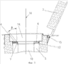 Защитное устройство 2 также включает ограждающую конструкцию 16, которая обеспечивает защиту от возможного воздействия различного рода ударных волн на боковую поверхность поворотной защитной крышки 3 при закрытом положении последней. Размер ограждающей конструкции 16 по высоте примерно равен толщине ограждаемой поворотной защитной крышки. В плане (т.е. на виде сверху) внутренний контур ограждающей конструкции 16 имеет форму, повторяющую форму ограждаемой поворотной защитной крышки 3. В варианте осуществления изобретения в плане внутренний контур ограждающей конструкции 16 имеет форму, например, квадрата со скошенными под 45° углами. При этом ребра 7 кольцевых сегментов 13 кольцевой решетки 6 располагаются соответственно параллельно вертикальным плоскостям, проходящим через диагонали упомянутого квадрата (т.е. перпендикулярно соответствующим угловым стенкам внутреннего контура ограждающей конструкции 16). Угол наклона « » струи газа, истекающей из кольцевого сегмента 13 кольцевой решетки 6, задается в зависимости от размера ограждающей конструкции 16 по высоте таким образом, чтобы возможная встреча газовой струи с элементами ограждающей конструкции происходила на наиболее удаленном от ракеты расстоянии.