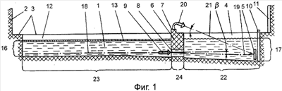 Продольное сечение бассейна акватира, предназначенного для плавания, подводной и надводной стрельбы, изображено на фиг.1, а на фиг.2 изображен вид сверху на бассейн акватира.