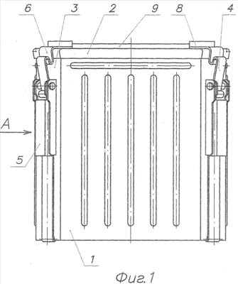 Требуемый технический результат достигается тем, что в известной герметичной металлической таре для укупорки патронов унитарного заряжания, укрепленных в звеньях спиральной ленты, содержащей корпус и крышку с поворотной скобой для переноски, соединенные посредством амортизаторов и рычажно-кулачковых запоров, согласно изобретению, рычаги запоров смонтированы на вертикальных скосах по углам корпуса, а сопрягаемые кулачки выполнены в виде открытых петель на концах пластинчатых коромысел, закрепленных на крышке вдоль коротких торцов, при этом каждое коромысло снабжено двумя симметричными зиг-выступами под поворотные скобы.
