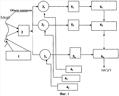 Устройство работает следующим образом. Источник структурированной подсветки (ИСП) 1 проецирует на контролируемый объект изображение структурированной подсветки в виде множества параллельных полос, ориентированных относительно системы координат XYZ заранее определенным образом. Изображение контролируемой поверхности объекта вместе с изображением искаженной неровностями поверхности объекта структурированной подсветкой воспринимается блоком регистрации изображения, который может быть выполнен в виде цифровой телекамеры 2. Сигнал, содержащий информацию о зарегистрированном изображении с телекамеры 2 поступает на входы модуляторов 31-3N. На вторые входы модуляторов 31-3N поступают сигналы от соответствующих генераторов опорных сигналов 41-4N, продуцирующие сигналы в виде пространственных одномерных решеток для обеспечения кодирования изображения полос с периодом, определяемым порядковым номером канала, тем большим, чем больше номер канала.