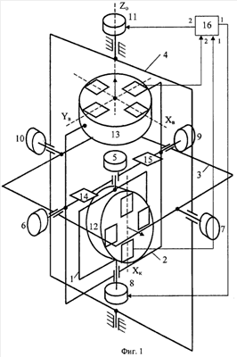После завершения процесса выставки система работает в режиме гирокомпаса. В этом режиме по сигналам датчиков наклона 14, 15 средняя рама 2 удерживается в плоскости горизонта, а по сигналам гироскопического чувствительного элемента 13 в блоке управления 16 аналитически рассчитывается азимут объекта. Для этого начальный сигнал о величине горизонтальной составляющей угловой скорости вращения Земли с выхода гироскопического чувствительного элемента 13 по второму входу поступает в блок управления 16, где запоминается. После запоминания первого значения горизонтальной составляющей угловой скорости вращения Земли с второго выхода блока управления 16 на вход устройства поворота 11 дополнительной рамы 4 карданова подвеса подается сигнал, по которому производится быстрый непрецессионный разворот гироскопического чувствительного элемента 13 вокруг вертикальной оси Zo в новое положение. В новом положении измеряется новое значение горизонтальной составляющей угловой скорости вращения Земли, которое поступает в блок управления 16 и запоминается. Количество положений, в которых измеряются составляющие угловой скорости вращения Земли, и их расположение выбираются исходя из принятого алгоритма определения азимута, примеры которых приведены в [3]. Функции блока управления 16 могут быть реализованы с помощью микропроцессорного устройства. По результатам выполненных замеров с помощью программы, построенной по алгоритмам [3] и загружаемой в микропроцессорное устройство, аналитически по формулам [3] рассчитывается исходный азимут объекта.