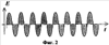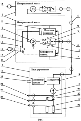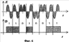 В случае, когда коммутирующие элементы 5 всех каналов 1 находятся в положении (0), преобразователи 6 всех каналов 1 отключены от проводника 3 и передача информации от канала 1 к блоку 2 управления не возможна. При этом все каналы 1 потребляют суммарный ток IMIN. Потребителями тока в каждом канале 1 являются источники 8 питания и дешифраторы 7. Каналы 1 готовы к приему команд от блока 2 управления. Команда, поступающая на информационный вход 23 блока 2 от внешнего управляющего устройства, например ЭВМ, содержит адресную часть и собственно код команды. Адресная часть включает адрес одного из каналов 1, для которого предназначена данная команда. Код команды содержит информацию для дешифратора 7 выбранного канала об установке оборудования канала в то или иное состояние, например: установка положения коммутирующего элемента 5, изменение коэффициента передачи усилителя 11, перестройка фильтров усилителя 11, временное отключение источника питания 8 от проводников 3, 4 на период выполнения каналом 1 высокоточных замеров (при этом питание производится от внутренних заряжаемых источников, содержащихся в блоке 8 питания, например конденсаторов), тестирование датчика 12 и других элементов канала 1 и т.п. Передача команд может осуществляться следующим образом. Команда поступает на информационный вход 23 шифратора 16, который преобразует ее в последовательный двоичный код. Код передается в модулятор 18, причем сначала адресная часть, а затем кодовое слово. Источник 17 (например, вторичная обмотка трансформатора) вырабатывает стабильное переменное напряжение, поступающее в модулятор 18. Модулятор 18 осуществляет фазовую манипуляцию (изменение фазы на 180°) переменного напряжения источника 17 в соответствии с поступающим на его информационный вход последовательным двоичным кодом (см. фиг.6, график D), при этом каждому двоичному разряду кода соответствует один период напряжения источника 17 ЭДС. При передаче единицы двоичного кода (D) фаза напряжения (Е) в течение периода не меняется. При передаче нуля кода (D) фаза напряжения е меняется в середине периода на 180° (см. фиг.6, график (Е)). Возможны другие варианты модуляции. Передача измерительной информации от датчика 12 одного из каналов 1 в блок 2 осуществляется следующим образом. Коммутирующий элемент 5 выбранного канала 1 командой устанавливается в положение (+) или положение (-). Предположим, что коммутирующий элемент 5 находится в положении (-), а коммутирующие элементы 5 всех других каналов 1 установлены в положение (0), т.е. преобразователи 6 этих каналов 1 отключены от проводника 3 и участия в процессе измерения не принимают. Переменное напряжение источника 17 со стабильной амплитудой (см. фиг.2, график Е) создает переменный ток в цепи, в которую источник 17 включен. При положительном полупериоде напряжения на верхнем по схеме (фиг.1) выводе источника 17 и на общем проводнике 3 ток протекает по следующей цепи: модулятор 18, общий проводник 3, вывод (-) коммутирующего элемента 5, диод 9, преобразователь 6, экранирующий проводник 4, резистор 19, диод 20, нижний по схеме (фиг.1) вывод источника 17. Вне зависимости от положения коммутирующих элементов 5 ток питает источники 8 всех каналов 1. Ток, протекающий через резистор 19, равен сумме тока, протекающего через преобразователь 6 выбранного канала 1, и токов всех каналов 1. При этом токи, потребляе