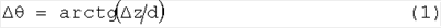 Расходомерная трубка, когда она приводится в вибрационное движение, на самом деле не смещается, но скорее циклично изгибается около местоположений, в которых она закреплена. Этот изгиб может быть аппроксимирован посредством поворота около точки(ек) крепления. Вибрацию тогда можно представить как цикличный поворот под малым углом около центра поворота, CR. Угловая амплитуда вибрации определяется из желаемой амплитуды вибрации в направлении по оси Z и расстояния d от центра поворота до центра трубки в местоположении привода. Угловая амплитуда вибрации  определяется из следующего соотношения: