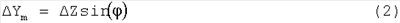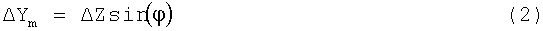 Смещение центра масс элемента привода (узла магнита или спирали) от осевой линии трубки приводит к тому, что центр масс элемента привода имеет компонент по оси Y его вибрации. Масса элемента привода обычно имеет смещение в направлении по оси Z, которое по меньшей мере эквивалентно радиусу трубки. Угловое смещение от осевой линии трубки не является незначительным. Масса элемента привода вибрирует около положения смещения с той же угловой амплитудой  , что и расходомерная трубка. Аппроксимируя движение массы привода, как перпендикулярное к линии, соединяющей центр массы привода с центром поворота CR, движение массы привода в направлении по оси Y Ym может быть определено из выражения: