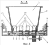 1. Устройство для дозированного выпуска связных трудносыпучих материалов, включающее корпус, выполненный с четырьмя попарно симметричными боковыми стенками и щелевым днищем, при этом под щелевым днищем корпуса установлена решетка, имеющая продольные щели, параллельные продольным щелям щелевого днища, расположенные с таким же шагом и имеющие такую же ширину, что и щели щелевого днища корпуса, решетка установлена с возможностью перемещения в поперечном щелям щелевого днища направлении на длину шага расположения ее продольных щелей и с возможностью фиксации ее положения, кроме того, устройство снабжено сводоразрушителем с рабочими органами, проходящими через продольные щели щелевого днища для очистки его поверхности, при этом сводоразрушитель установлен на каретке с возможностью возвратно-поступательного перемещения вдоль щелей щелевого днища посредством привода, отличающееся тем, что боковые стенки корпуса выполнены наклонными к его щелевому днищу, при этом длина двух размещенных друг напротив друга боковых стенок превышает длину двух других размещенных друг напротив друга боковых стенок, кроме того, более короткие боковые стенки корпуса расположены под острым углом к его щелевому днищу, а две другие, более длинные боковые стенки корпуса, – под тупым углом к его щелевому днищу, кроме того, в нижней части более коротких боковых стенок корпуса выполнены щели, являющиеся продолжением продольных щелей щелевого днища, а сводоразрушитель снабжен дополнительными боковыми рабочими органами, установленными на каретке с возможностью перемещения вдоль более длинных наклонных боковых стенок корпуса, причем боковые рабочие органы закреплены на стойках, которые пропущены через щели щелевого днища и закреплены нижними концами на каретке с возможностью взаимодействия с более длинными наклонными боковыми стенками корпуса.
