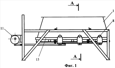 Как показано на графических материалах, устройство для дозированного выпуска связных трудносыпучих материалов включает корпус 1, выполненный с четырьмя попарно симметричными боковыми стенками 2, 3 и щелевым днищем 4. Под щелевым днищем 4 корпуса 1 установлена решетка 5, имеющая продольные щели 6, параллельные продольным щелям 7 днища 4, расположенные с таким же шагом и имеющие такую же ширину, что и щели 7 днища 4 корпуса 1. Решетка 5 установлена с возможностью перемещения в поперечном щелям 7 днища 4 корпуса 1 направлении на длину шага расположения ее продольных щелей 6 и с возможностью фиксации ее положения. Устройство снабжено сводоразрушителем 8 с рабочими органами 9, проходящими через продольные щели 7 щелевого днища 4 для очистки его поверхности. Сводоразрушитель 8 установлен на каретке 10 с возможностью возвратно-поступательного перемещения вдоль щелей 7 щелевого днища 4 посредством привода 11. Боковые стенки 2, 3 корпуса 1 выполнены наклонными к его щелевому днищу 4, при этом длина двух размещенных друг напротив друга боковых стенок 2 превышает длину двух других размещенных друг напротив друга боковых стенок 3. Более короткие боковые стенки 3 корпуса 1 расположены под острым углом к его щелевому днищу 4, а две другие, более длинные, боковые стенки 2 корпуса – под тупым углом к его щелевому днищу 4. В нижней части более коротких боковых стенок 3 корпуса 1 выполнены щели 12, являющиеся продолжением продольных щелей 7 щелевого днища 4. Сводоразрушитель 8 снабжен дополнительными боковыми рабочими органами 13, установленными на каретке 10 с возможностью перемещения вдоль более длинных наклонных боковых стенок 2 корпуса 1. Дополнительные боковые рабочие органы 13 закреплены на стойках 14, которые пропущены через продольные щели 7 щелевого днища 4 и закреплены нижними концами на каретке 10 с возможностью взаимодействия с более длинными наклонными боковыми стенками 2 корпуса 1. Каретка 10 установлена с возможностью возвратно-поступательного перемещения по направляющим 15, расположенным вдоль более длинных боковых наклонных стенок 2 корпуса 1. Угол наклона более длинных боковых стенок 2 корпуса 1 к его щелевому днищу 4 соответствует углу откоса сыпучего материала.