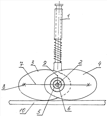 Оно состоит из ручки 1, на которой крепится ось 2. На ось 2 надеты подвижные эллипсы 3 и 4 со шкалами 5 и 6. На оси 2 неподвижно крепится плоская пружина 7, которая своими концами привинчивается винтами 8 к подвижным эллипсам 3 и 4. К оси 2 крепится указательная стрелка 9.
