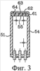Измерительная головка 51, поперечный разрез которой показан на фиг.3, имеет корпус 54 цилиндрической формы, в передней стенке 55 которого выполнено несколько отверстий 61-64, предназначенных для размещения концов различных оптических волокон системы. Первое из этих отверстий, отверстие 61, выполнено перпендикулярно внешней поверхности передней стенки 55 и имеет такую форму, чтобы одновременно вмещать освещающее оптическое волокно 2 и измерительное волокно 3. Три других отверстия 62, 63, 64 ориентированы под увеличивающимися углами относительно направления первого отверстия, то есть, например под углами 10°, 20° и 30°, а их направления сходятся, при этом каждое из них вмещает конец дополнительного оптического волокна, соответственно 41, 42, 43.