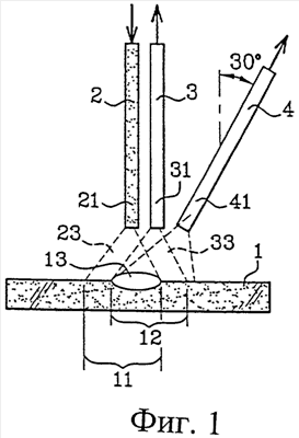 Схема на фиг.1 показывает движущуюся стальную полосу, где зона 11 ее поверхности 1 освещается инфракрасным излучением 23 из конца 21 освещающего оптического волокна 2, удерживаемого перпендикулярно к поверхности полосы. Конец 31 второго оптического волокна 3, параллельного освещающему волокну 2 и находящегося в непосредственной близости от него, расположен на том же самом уровне, что и конец первого волокна, и улавливает отраженное излучение 33, подаваемое освещающим оптическим волокном и отражаемое полосой.
