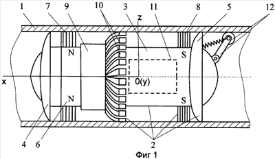 На фиг.1 позицией 1 обозначена часть ферромагнитного трубопровода. Позицией 2 изображен внутритрубный снаряд-дефектоскоп. В его состав входит герметичный контейнер 3 с эластичными манжетами 4 и 5 из полиуретана в передней и задней частях контейнера 3, выполненными для центрирования снаряда ВСД 2 в трубопроводе 1. На контейнере 3 закреплен постоянный магнит 6 с полюсами N и S, к которым прикреплены щетки-магнитопроводы 7 и 8 по радиальным направлениям. Утолщенная часть 9 контейнера 3 предназначена для крепления к ним дефектоскопических датчиков 10. Между полюсами N и S магнита 6 закреплен ряд дефектоскопических датчиков 10, предназначенных для измерения напряженностей магнитного поля, каждый из которых представляет собой полиуретановую пружинящую пластину, в которую залита также матрица магниточувствительных датчиков для измерения индукции (напряженности) магнитного поля. Наличие постоянного магнита 6 и ряда датчиков 10 магнитного поля свидетельствует о том, что ВСД 2 является как коррозионным снарядом, определяющим нарушение материала в стенках трубы, так и устройством определения его расстояния. Внутри контейнера 3 установлен блок электроники 11 и блок источников электрического питания (не показан). В задней части ВСД 2 закреплен колесный одометр 12 [1]. С контейнером 3 жестко связана система координат OXYZ, где ОХ – продольная ось, оси ОУ и OZ – нормальная и поперечная.