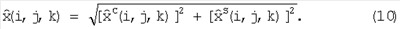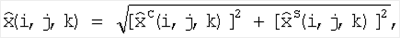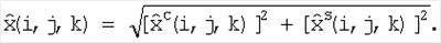 затем полученные оценки возводят в квадрат, суммируют и извлекают корень, тем самым вычисляют оценки амплитуд отраженного сигнала в i-x элементах дальности и j,k-м синтезированном элементе разрешения по углам: