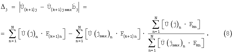 Из выражения (4) видно, что в случае одиночной цели полученные коэффициенты определяются отношением комплексных амплитуд сигналов на выходе доплеровских фильтров и не зависят от того, в каком стробе дальности они получены. В смежном стробе дальности, например (k+1)-м, при помощи вычисленных коэффициентов (4) найдем разности между комплексными амплитудами сигналов в соответствии с выражением (2)