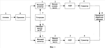 Изобретение поясняется чертежами на фиг.1-10. На фиг.1 изображена структурная схема импульсно-доплеровской РЛС, реализующей предлагаемый способ обнаружения групповой цели, где 1 – фазовый детектор, 2 – фильтр нижних частот, 3 – аналого-цифровой преобразователь, 4 – сумматор, 5 – антенна, 6 – приемник, 7 – гетеродин, 8 – процессор обработки сигналов.