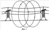 на фиг.1 – расположение силовых линий магнитного поля вокруг проводов ЛЭП, вызванных протеканием транспортного тока по проводам;