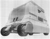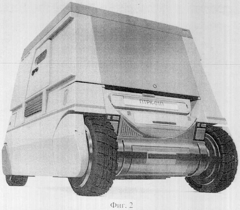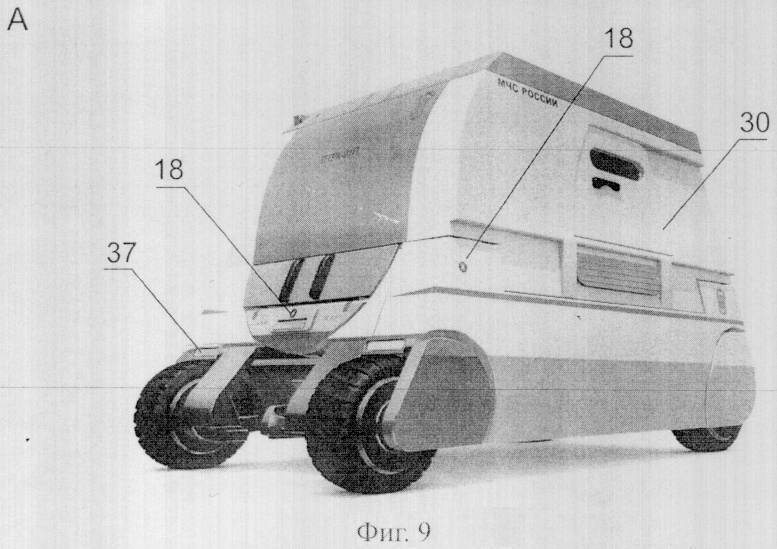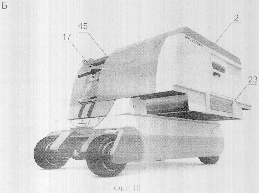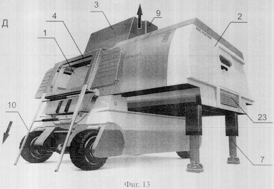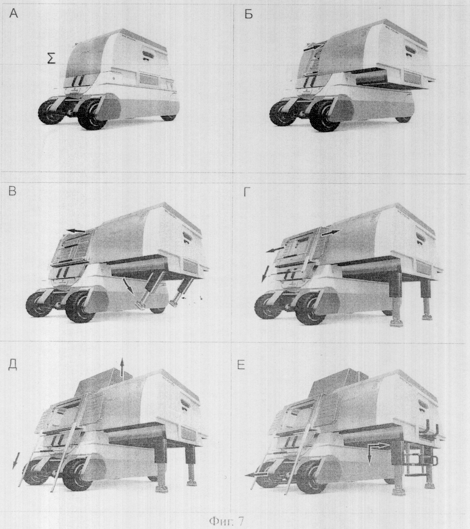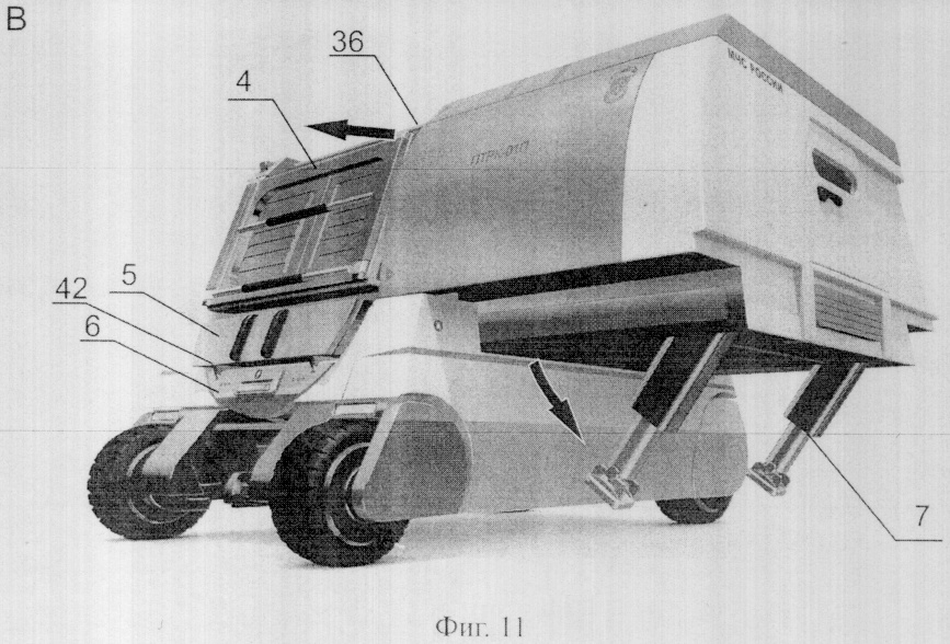 Трансформация проходит в несколько стадий (фиг.7). Сначала отодвигается в сторону кабина оператора 2, Б (фиг.7, 10). Она движется по нижним направляющим рельсам стороны основания корпуса, сверху движение контролируется по цилиндрическим направляющим 36. Таким образом, кабина при трансформации постоянно фиксирована в четырех геометрических точках, что обеспечивает точность движения и надежность опоры. При занятии кабиной рабочего положения автоматически выдвигаются опоры 7 до уровня грунта. Это необходимо для создания устойчивого равновесия кабины 2 в рабочем положении, так как в данной точке трансформации две трети кабины оператора 2 оказываются над землей без поддержки основания корпуса.