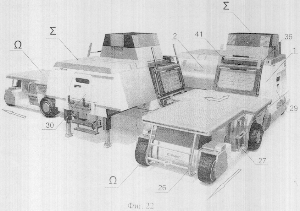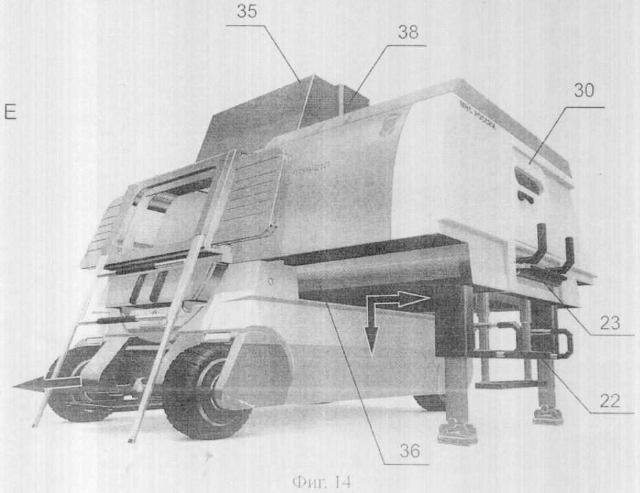 Следующим этапом трансформации является выдвижение лестниц и ступеней (фиг.14). Во-первых, это шлюзовые рельсовые телескопические лестницы 10. Приводы, приводящие их выдвижение, расположены в шлюзовых выходах 4. Шлюзовые выходы 4 имеют предусмотренные для монтажа приводов полости во внутренней структуре. Во-вторых, выдвижная лестница подъема в кабину оператора 22. В сложенном виде она размещена в полости в нижней части кабины оператора 44. Процесс выдвижения происходит в две стадии. Сначала опускается вниз вся конструкция лестницы за счет телескопического привода, затем происходит опускание нижней ступени, вложенной в полости верхней ступени, и выдвигаются поручни.