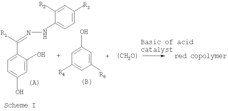 В соответствии с предпочтительным способом получения, полимеры Р изобретения получают конденсацией 4-{1-[(2,4-ди(замещенный)фенил)гидразоно]алкил}бензол-1,3-диола с 3,5-дизамещенным фенолом и формальдегидом или параформальдегидом в присутствии либо основного (например, NaOH), либо кислотного (например, HCl) катализатора в смесях вода/спирт в качестве растворителя и при температуре, достаточной для образования метилольного промежуточного соединения (в соответствии со схемой 1):