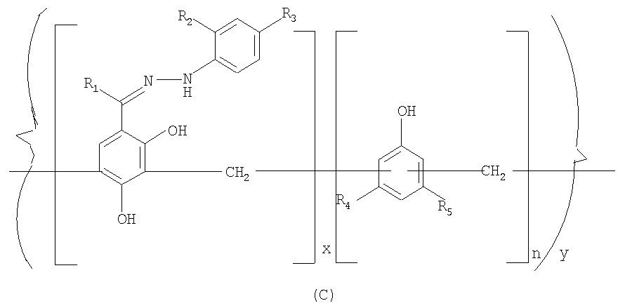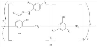 Полимер Р получают также процедурой в одном реакторе или каскадной процедурой с использованием в качестве отдельных компонентов 4-ацил/формилбензол-1,3-диола, 2,4-дизамещенного фенилгидразина, 3,5-дизамещенных фенолов и формальдегида или параформальдегида с заместителями, указанными выше.