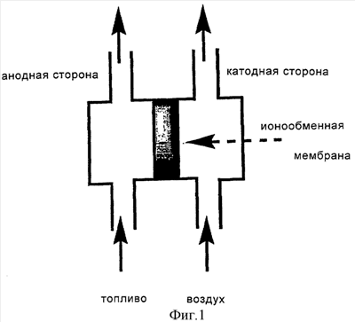 На фиг.1 представлено схематическое изображение поперечного сечения упрощенного топливного элемента, работающего с катализатором изобретения.