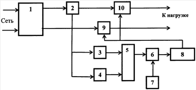 Устройство функционирует следующим образом. При включении в сеть нагрузки в первом датчике тока 2, включенном в прямой провод, возникает скачок тока, скорость которого определяется величиной нагрузки, пороги срабатывания пороговых устройств выбраны таким образом, что первым срабатывает первое 3 пороговое устройство и переводит триггер 5 в «единичное» состояние. Срабатывание второго 4 порогового устройства приводит к установке триггера 5 в «нулевое» состояние. Длительность импульса на выходе триггера 5 будет пропорциональна скорости нарастания скачка тока в прямом проводе. Во время действия импульса с выхода триггера 5 на вход элемента И 6 на его выходе формируется последовательность импульсов с генератора 7 импульсов, поступающая на вход сдвигового регистра 8. Выходной сигнал сдвигового регистра 8 формируется таким образом, что он формируется при малом числе импульсов (высокой скорости нарастания скачка тока) на его входе. Сигналом с выхода сдвигового регистра 8 первый 9 и второй 10 электронные выключатели переводятся в разомкнутое состояние. Перевод схемы в исходное состояние производится с помощью выключателя 1.
