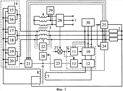 Входные 1 и выходные 2 зажимы, предназначенные для подключения соответственно к трехфазной сети и трехфазной нагрузке, трехфазный силовой трансформатор 3 с первичными и вторичными фазными обмотками 4 и 5, однофазный понижающий высокочастотный трансформатор 6 с первичной и вторичной обмотками 7 и 8, трехфазно-однофазный преобразователь частоты со звеном постоянного тока 9, в состав которого входит трехфазный выпрямитель 10 с системой управления 11 и однофазный инвертор напряжения 12 с системой управления 13. Кроме этого, устройство содержит однофазно-трехфазный непосредственный преобразователь частоты 14 с катодными 15, 17, 19 и анодными 16, 18, 20 тиристорными группами с естественной коммутацией и системой управления 21. К основным элементам устройства также относятся: формирователь синхроимпульсов 22, умножитель частоты 23, датчик среднего отклонения от действующих значений трехфазного напряжения нагрузки 24 и блок датчиков отклонения фазных действующих напряжений нагрузки 25, датчик реактивной мощности сети 26 в комплекте с измерительными трансформаторами тока и напряжения, элемент сравнения 27, блок регулирования фазы 28, а также батарея косинусных конденсаторов 29 и фильтрокомпенсирующее устройство 30.