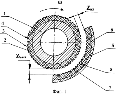 Рабочие поверхности 2 барабана 1 и 6 деки 5 выполнены из упругого материала, например резины, имеют выступы 3 и 7 соответственно, чередующиеся со впадинами 4 и 8, которые располагаются по всей длине барабана 1 и деки 5 поперек траектории движения семенного материала в рабочей щели, образованной барабаном 1 и декой 5 от зазора на входе Zвх к зазору на выходе Zвых. Зазоры на входе Zвх и выходе Zвых рабочей щели между барабаном 1 и декой 5 устанавливаются одинаковыми по величине и не более 2,5 мм, что обеспечивает движение семенного материала в один слой и гарантированный одновременный контакт плода эспарцета с выступами 3 барабана 1 и выступами 7 деки 5.