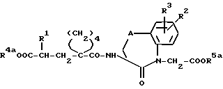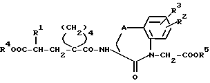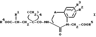 Согласно описанным в вышеприведенных примерах способам также можно получать указанные в последующей таблице 1 соединения формулы (I):Пример I: Таблетки, содержащие (3S,2’R)-3-(1-/2′- (этоксикарбонил)-4′-фенил-бутил/циклопентан-1-карбониламино) -2,3,4,5-тетрагидро-2-оксо-1H-1-бензазепин-1-уксусную кислоту. Готовят таблетки следующего состава, в расчете на одну таблетку, мг: (3S, 2’R)-3-(1-/2′-(Этоксикарбонил)-4′-фенил-бутил/циклопентан- 1-карбониламино)-2,3,4,5-тетрагидро-2-оксо-1H-1-бензазепин-1- уксусная кислота – 20 Кукурузный крахмал – 60 Молочный сахар – 135 Желатина (в виде 10%-ного раствора) – 6 Биологически активное вещество, кукурузный крахмал и молочный сахар концентрируют вместе с 10%-ным раствором желатины. Пасту размельчают и образовавшийся гранулят наносят на пригодный металлический лист и высушивают при 45oC. Высушенный гранулят пропускают через машину для размельчения и в миксере смешивают со следующими другими вспомогательными веществами, мг: Тальк – 5 Стеарат магния – 5 Кукурузный крахмал – 9 и затем прессуют в таблетки весом 240 мг Пример II: Раствор для инъекции, содержащий (3S,2’R)-3-/1- (2′-карбокси-4′-фенил-бутил)циклопентан-1-карбониламино-2,3,4,5-тетрагидро-2-оксо-1H-1-бензазепин-1-уксусную кислоту. Готовят раствор для инъекции следующего состава, в расчете на 5 мл, мг: (3S,2’R)-3-/1-(2′-Карбокси-4′-фенил-бутил)-циклопентан-1- карбониламино/-2,3,4,5-тетрагидро-2-оксо-1H-1-бензазепин-1-уксусная кислота – 10 Na2HPO4 7H2O – 43,24NaH2PO4 2H2O – 7,72NaCl – 30,0 Очищенная вода – 4948,0 Твердые вещества растворяют в воде, раствор стерилизуют и порциями, смотря по обстоятельствам, по 5 мл разливают в ампулы. Формула изобретения