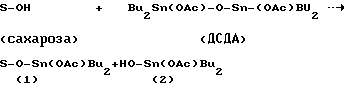 (57) Реферат: Описывается способ, который включает 4 стадии: (1) приготовление первой реакционной смеси, содержащей сахарозу и полярный апротонный растворитель, (2) добавление 1,3-диацилокси-1,1,3,3-тетра(гидрокарбил)-дистанноксана в первую реакционную смесь с образованием второй реакционной смеси, (3) пропускание паров второго растворителя, способного удалять воду путем совместной перегонки, через вторую реакционную смесь, в достаточном количестве и в течение времени, достаточного для удаления, по существу, всей воды из указанной реакционной смеси путем совместной перегонки, с образованием посредством этого третьей реакционной смеси, содержащей указанные полярный апротонный растворитель и второй растворитель, причем вторая реакционная смесь, по существу, не содержит воду, и (4) добавление ангидрида карбоновой кислоты к третьей реакционной смеси для образования четвертой реакционной смеси и поддерживания четвертой реакционной смеси при температуре и в течение времени, достаточных для получения сложного эфира сахарозы по положению 6. Технический результат – упрощение процесса, улучшение качества целевого продукта и улучшение селективности процесса. 3 с. и 19 з.п. ф-лы. Изобретение относится к усовершенствованию способа региоселективной этерификации сахарозы с использованием сложного диэфира дистанноксана в качестве катализатора. Искусственный подсластитель 4,1′,6′-трихлор-4,1’6′-тридеоксигалактосахарозу (“сукралозу”) получают из сахарозы путем замещения гидроксилов в положениях 4, 1′ и 6′ хлором (в способе изготовления подсластителя стереоконфигурация в положении 4 обращена – поэтому соединение является галактосахарозой). Направление атомов хлора только в требуемые положения является главной проблемой синтеза, так как гидроксилы, которые замещаются, обладают различающейся реакционной способностью; два являются первичными, а один является вторичным. Кроме того, синтез осложнен тем, что первичный гидроксил в положении 6 является незамещенным в конечном продукте. Разработано несколько различных путей синтеза для получения сукралозы, в которых перед хлорированием гидроксилов в положениях 4, 1′ и 6′ вначале блокируют реакционноспособный гидроксил в положении 6, например, сложноэфирной группой, с последующим гидролизом для удаления сложноэфирного заместителя, чтобы получить сукралозу. Некоторые из таких путей синтеза включают олово-опосредованный (с использованием олова) синтез сложных эфиров сахарозы по положению 6. Иллюстрациями являются олово-опосредованные схемы, которые описаны Navia (патент США N 4 950 746), Neiditch et al. (патент США N 5 023 329) и Walkup et al. (патент США N 5 089 608). В EP A 0 475 619, опубликованной 18 марта 1992 г., а также в патенте США N 5 470 969 (частичное продолжение заявки США, на которой была основана ЕРА 0 475 619) описан усовершенствованный способ получения сложного эфира сахарозы по положению 6. Данный способ включает проведение реакции сахарозы с ангидридом карбоновой кислоты в реакционной смеси, содержащей полярный апротонный растворитель и 1,3-диацилокси- 1,1,3,3-тетра(гидрокарбил) дистанноксан (“сложный диэфир дистанноксана” или “ДЭДС”), в течение времени и при температуре, которые достаточны для образования сложного эфира сахарозы по положению 6. В одном из своих важных аспектов катализируемый ДЭДС процесс включает стадии