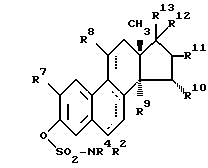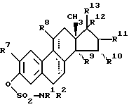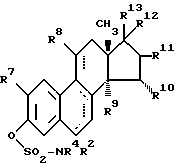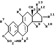 (57) Реферат: Изобретение относится к сульфаматным производным производных 1,3,5(10)-экстратриена общей формулы (I), где R1 – COR3, -COOR4, -CONR5R6, -SO2R4 или -SO2NR5R6, где R3 и R4 независимо C1 – C5алкил, C3 – C6циклоалкил или фенил, R5 и R6 независимо C1 – C5алкил; R2 – атом водорода или C1 – C5алкил; R7 и R8 независимо атом водорода или C1 – C5алкоксигруппа; R9 и R10 – атом водорода или совместно метиленовая группа; R11 – R13 независимо атом водорода или гидроксильная группа, при необходимости этерифицированная физиологически приемлемыми неорганическими или органическими кислотами, или R12 и R13 алкинил до 5 атомов углерода и R8, R11 и R12 независимо расположены в – или -положении. Кроме того, описан способ получения соединений I и фармацевтические составы, содержащие эти соединения. Соединения согласно изобретению обладают эстрогенным действием. 3 с. и 1 з. п. ф-лы, 4 табл.
