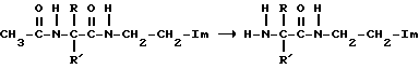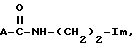 Изобретение рассматривает псевдодипептидные продукты, и в особенности новый псевдодипептидный продукт, содержащий имидазольную или имидазол N-замещенную группу, а также применение указанных продуктов в терапии, косметической сфере и пищевой промышленности. Объектом изобретения является новый псевдодипептидный продукт, имеющий общую формулу ![]() в которой A является: а) или в форме ![]() и B представляет собой амин, в котором атом азота непосредственно связан с углеродным атомом и выбран из группы, состоящей из: 1) первичного амина; 2) вторичного амина, имеющего формулу -NH-X, в которой X является углеводородным радикалом, фторалкилом, или ацилом, или амином; 3) четвертичным циклическим амином циклоалкильного типа или лактамом; 4) четвертичным амином с формулой в которой Y и Y’ являются углеводородным радикалом, ацилом или оксиацилом;5) имином с формулой в которой Y является углеводородным радикалом и Y’ атомом водорода или углеводородным радикалом; иб) аммонием с формулой ![]() в которой Y, Y’, Y” являются углеводородным радикалом и ион W является галогенидом, сульфатом, фосфатом, бикарбонатом, паратолуол-сульфатом или соединением, несущим карбоксильную группу. R является атомом фтора, фторалкильным радикалом, функциональной группой, такой как сульфат, фосфат или карбоксильная, ацильным радикалом, линейной алкильной цепью, способной к замещению одной или несколькими функциональными группами, или алкениловым (олефиновым) радикалом, или арилом, способным к замещению одной или несколькими функциональными группами, R’ является атомом водорода, фтора, алкильным радикалом или фтор-алкильным радикалом, Im является имидазолом или N-замещенным имидазолом, таким как ![]() ![]() ![]() ![]() ![]() и R является атомом водорода, или фтора, или фтор-алкил радикалом, ацилом или углеводородным радикалом, способным к замещению одной или несколькими функциональными группами и R” является ацильным радикалом или углеводородным радикалом, способным к замещению одной или несколькими функциональными группами. В тех случаях, когда общая формула псевдодипептидного продукта представлена в форме а) с B, являющимся лактамом, в частности – или -лактамом, или циклическим четвертичным амином, в качестве которого могут использоваться– азиридин ![]() В случае, когда общей формулой псевдодипептидного продукта является форма а), аммоний или имидазольное кольцо включает в себя дополнительный атом водорода на атоме азота, ион W может быть галогенидом, сульфатом, фосфатом, бикарбонатом, паратолуолсульфонатной группой, соединением, несущим кислую карбоксильную группу, такую как ацетат, трифторацетат, цитрат, глюконат, пикрат, или аминокислота, такая как аспартат или глютамат. В случае, когда общей формулой псевдодипептидного продукта является форма а) или б) с R, R’ или R”, являющимся углеводородным радикалом, этот последний радикал может быть замещен одной или несколькими функциональными группами, такими как спирт, амин, карбоксил, алкокси, тиоэфир, тиол, фосфат или сульфат. Некоторые члены семейства указанных соединений способны к образованию стабильных комплексов с атомами, относящимися к ряду переходных металлов, “хелатов”, содержащих атом металла, такого как цинк, медь, железо, кобальт, марганец или никель; выбор цинка является предпочтительным для образования хелата с одн