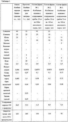 Изобретение предназначено для использования в мясной промышленности при производстве колбасных изделий. Сущность изобретения заключается в том, что в состав фарша колбасных изделий вводят культивируемые грибы как основной белковый компонент в количестве от 30 до 70 кг на 100 кг несоленого сырья. Изобретение обеспечивает повышение пищевой и биологической ценности колбасных изделий без снижения их органолептических показателей. Полученные колбасные изделия пригодны для профилактического и диетического питания. 2 з.п. ф-лы, 1 табл.