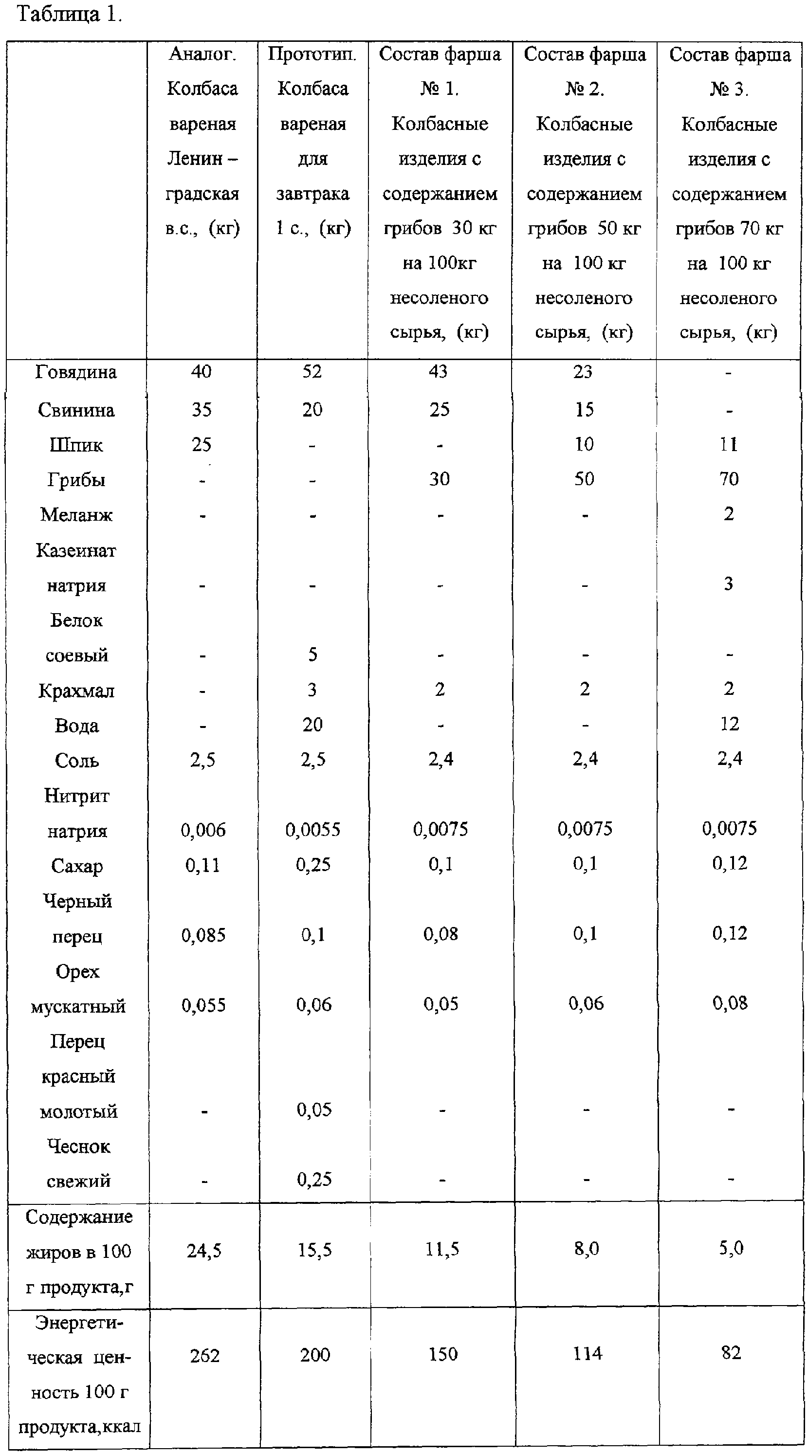 1. Фарш для колбасных изделий, содержащий белковые компоненты, крахмал, пряности и материалы, отличающийся тем, что в качестве белковых компонентов используют на 100 кг несоленого сырья культивируемые грибы в количестве 30-70 кг, мясное сырье или меланж и казеинат натрия в количестве соответственно 5-68 кг и 5 кг, а крахмал вводят в количестве 2 кг, пряности и материалы – в количестве 2,6375-2,7275 кг в зависимости от рецептуры. 2. Фарш по п.1, отличающийся тем, что дополнительно используют жировой компонент в количестве до 11 кг на 100 кг несоленого сырья. 3. Фарш по пп.1 и 2, отличающийся тем, что дополнительно используют воду в количестве до 12 кг на 100 кг несоленого сырья.