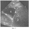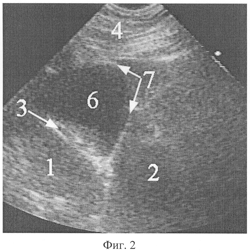 На фиг.2 обозначено: 1 – печень, 2 – сердце (лоцируется нечетко при движении), 3 – медиальная поверхность правого купола диафрагмы, 4 – мягкие ткани грудной стенки, 6 – целомическая киста перикарда, 7 – капсула целомической кисты перикарда.