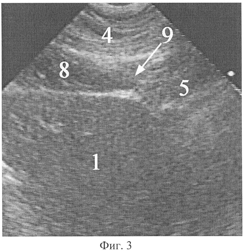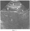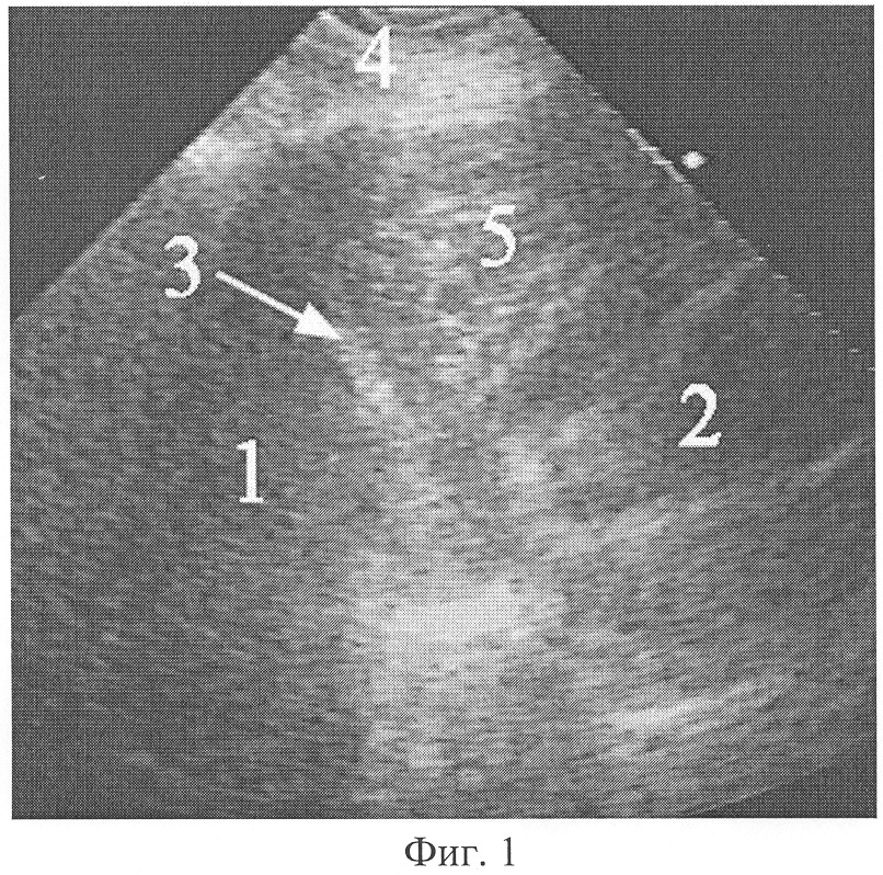 На фиг.1 обозначено: 1 – печень, 2 – сердце (лоцируется нечетко при движении), 3 – медиальная поверхность правого купола диафрагмы, 4 – мягкие ткани грудной стенки, 5 – абдоминомедиастинальная липома.