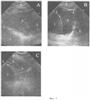 А – поперечное сканирование абдоминомедиастинальной липомы из-под мечевидного отростка с направлением оси сканирования к правому плечу, В – поперечное сканирование целомической кисты перикарда из-под мечевидного отростка с направлением оси сканирования к правому плечу, С – продольное сканирование сообщения абдоминомедиастинальной липомы с предбрюшинной жировой клетчаткой,