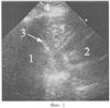 Фиг.1. Эхограмма абдоминомедиастинальной липомы при поперечном ультразвуковом сканировании справа парастернально из межреберья над местом прикрепления реберной дуги к грудине.