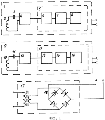 Схема устройства содержит источник питания в составе понижающего трансформатора 17 и выпрямителя 18 (двухпериодного).