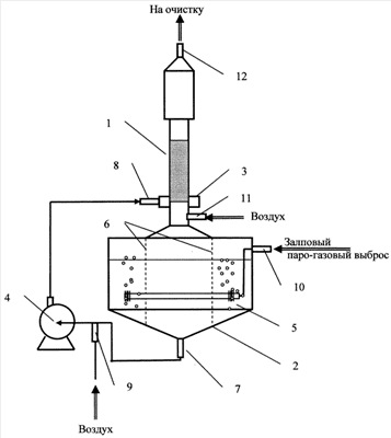 Барботаж газов через слой раствора большой высоты при соответствующем соотношении газ: раствор, а затем обработка в высокотурбулизированном пенном слое позволяет эффективно улавливать высококонцентрированные залповые парогазовые выбросы.