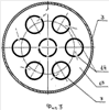 Работа предложенного трубного узла ввода циклогексаноноксима в сернокислотный раствор капролактама заключается в следующем. При циркуляции по трубопроводу 1 основного потока – сернокислотного раствора капролактама производительностью 500 м3/час продукт поступает в трубную катушку 3 (скрепленную с циркуляционным трубопроводом 1 фланцевыми соединениями 2). Сталкиваясь с перегородкой 5, поток разделяется на струи, входящие – проходящие через патрубки 7. В месте входа потока в каждый патрубок 7, в его начальном участке за счет резкой формы препятствия (перегородка 5 – патрубок 7), возникает зона сужения-сжатия поперечного сечения струи (по экспериментальным данным отношение площади сечения максимально сжатой струи и внутреннего сечения патрубка для круглых отверстий на жидкости составляет 0,6). При этом в начальном пристеночном участке патрубка реализована зона вакууммирования, образованная с одной стороны внутренней поверхностью патрубка, а с другой – криволинейной поверхностью, повторяющей форму сжатия потока. Каналы 14, отстоящие от входной плоскости перегородки 5 на расстоянии «L» – не более 0,5 внутреннего диаметра патрубка, введены именно в эту зону. Циклогексаноноксим, поступающий через штуцер 47 м3/час, попадает в полость 13, образованную перегородками 5 и 6, и далее по каналам 14 в патрубках 7 – в сернокислотный раствор капролактама. Причем, как уже отмечалось, место ввода циклогексаноноксима (по заданному расстоянию «L») – в зоне гарантированного вакууммирования.