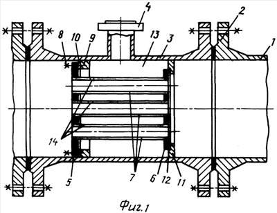 Предложенный трубный узел ввода циклогексаноноксима в сернокислотный раствор капролактама, Фиг.1, 2, 3, состоит из трубопровода 1 (основного потока – сернокислотного раствора капролактама производительностью 500 м3/час), в который, например, фланцевыми соединениями 2 вставлена трубная катушка 3 с перпендикулярно приваренным штуцером 4 ввода циклогексаноноксима (расход до 7 м3/час). В трубную катушку 3 помещен сварной узел, выполненный из двух перегородок 5 и 6, установленных на концах патрубков 7 и приваренных к ним. Первая (по ходу потока продукта) перегородка 5 скреплена болтами 8 с приварными кронштейнами 9 внутри катушки. Перегородкой 5 и кронштейнами 9 образовано уплотнительное соединение с прокладкой 10. Аналогичное уплотнение образовано второй перегородкой 6, кронштейнами 11 и прокладкой 12 на выходе сернокислотного раствора капролактама (на выходном торце патрубков 7). Конструкция внутреннего сварного узла принята в разъемном исполнении для экспериментальной «доводки» – минимизации гидросопротивления, т.к. этот раздел механики сплошной среды целиком базируется на экспериментальных данных. При заранее отработанном варианте перегородки 5 и 6 просто привариваются к трубной катушке 3. Перегородками 5 и 6 и трубной катушкой 3 образована замкнутая – герметичная – межпатрубочная полость 13.