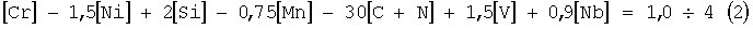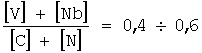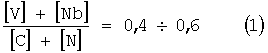 где [Cr], [Ni], [Mn], [Si], [C+N], [V], [Nb] – концентрация в стали хрома, никеля, марганца, кремния, углерода и азота, ванадия, ниобия соответственно, выраженная в мас.%. Элементы ванадий, ниобий, углерод и азот образуют в стали дисперсные частицы нитридов и карбонитридов ванадия и ниобия, сдерживающие рост зерна в стали при нагреве под закалку, т.е. способствующие формированию мелкозернистой структуры стали, необходимой для получения высокой прочности. Уравнение (1) регулирует соотношение V, Nb, С и N таким образом, чтобы в стали образовывалось оптимальное количество частиц нитридов и карбонитридов и сталь при высокой прочности сохраняла пластичность. Так, при избыточном содержании ванадия и ниобия, приводящем к получению больших, чем в уравнении (1), значений, сталь имеет низкие значения характеристик пластичности стали из-за высокого содержания карбонитридов ванадия и ниобия (плавка 6 в табл.2). Уравнение (2) регулирует соотношение и количество мартенсита и остаточного аустенита в стали за счет учета феррито- и аустенитообразующей способности входящих в состав стали элементов (с использованием коэффициентов из уравнений для оценки эквивалентов феррито- и аустенитообразования). Соотношение компонентов в рамках уравнения 2 (при соблюдении уравнения 1) позволяет получить оптимальную структуру с заданным количеством мартенсита (75-90%) и аустенита (25-10%), не содержащую Граничные условия по концентрациям отдельных элементов, входящих в состав стали, обусловлены следующими факторами. У стали с содержанием хрома более 16,5% и никеля менее 4,8% (пл.6) не достигается достаточной для практического использования пластичности. При концентрации хрома менее 15,5% (плавка 5) и никеля более 5,8%, а азота более 0,18% невозможно получить качественные (без пор) крупные слитки из-за низкой растворимости азота в жидкой стали при таком содержании хрома и никеля. Содержание азота менее 0,11% (пл. 5) не обеспечивает достаточной прочности, а более 0,18% (пл.6) – пластичности стали. Введение в заявляемую сталь более 0,07% углерода (пл.6) приводит к понижению пластичности в результате преимущественного выделения по границам зерен крупных частиц карбида хрома типа Cr23C6. Для получения стали с содержанием углерода менее 0,04% необходима специальная технология выплавки. Добавки ванадия и ниобия в количестве 0,03-0,08% каждого обеспечивают получение мелкозернистой структуры. Добавки этих элементов в меньшем количестве, чем 0,03%, неэффективны, а при их концентрации свыше 0,08% возможны низкие значения характеристик пластичности стали из-за высокого содержания карбонитридов ванадия и ниобия. Добавки кальция в количестве 0,02-0,03% в заявляемую сталь существенно улучшают ее обрабатываемость резанием. Химический состав и механические свойства металла исследованных плавок предложенной и известной сталей приведены в табл.1 и 2.