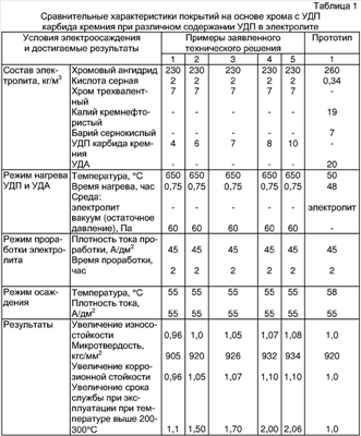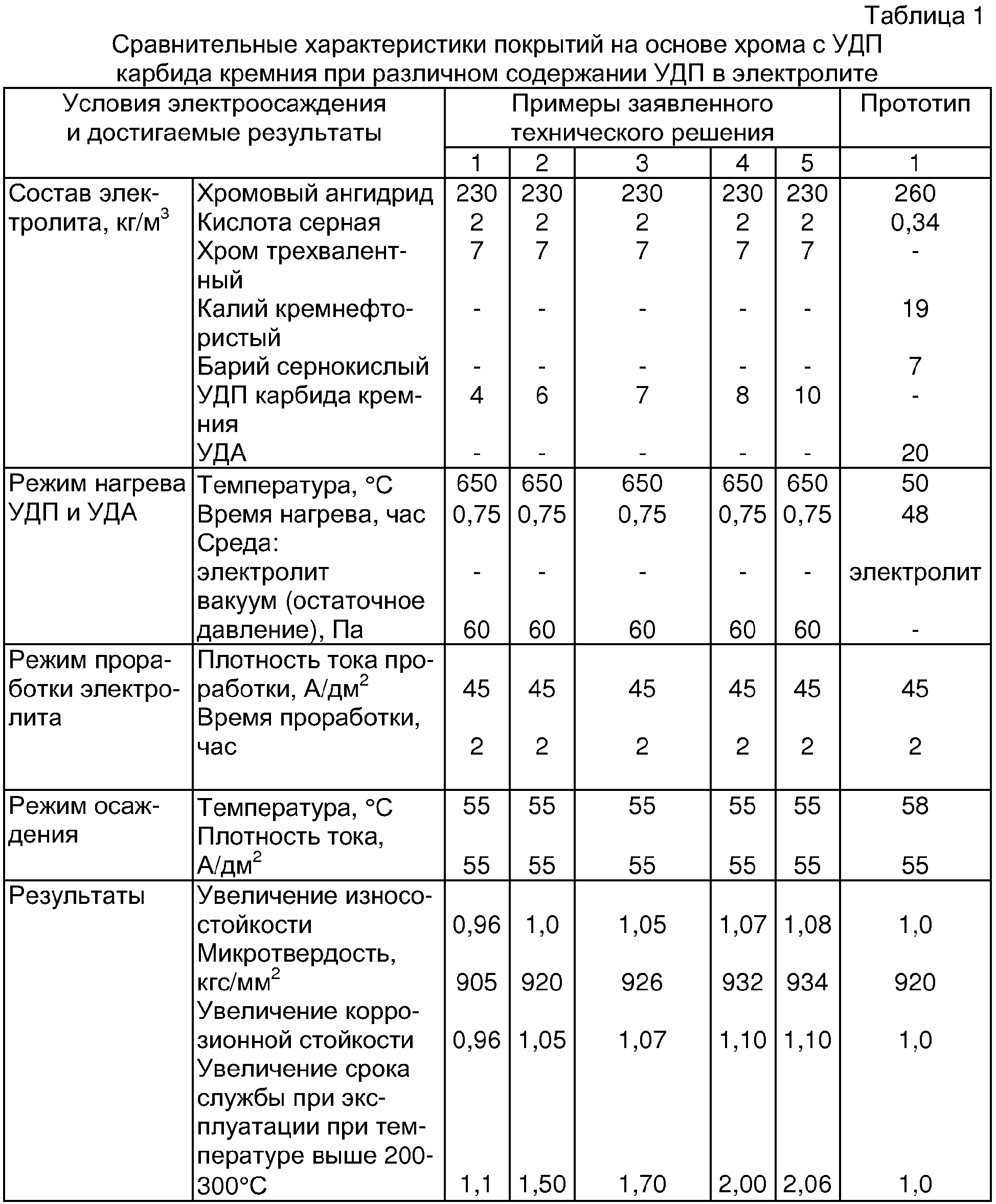 Изобретение относится к области гальванотехники, а именно к получению композиционных электрохимических покрытий из электролитов хромирования с использованием в качестве второй фазы ультрадисперсного порошка карбида кремния. Способ включает введение в электролит ультрадисперсного порошка и осаждение при температуре 50-60°С и плотности тока 50-60 А/дм2, при этом в качестве ультрадисперсного порошка используют карбид кремния с удельной поверхностью 20000-40000 м2/кг в количестве 6-8 кг/м3, содержащий не более 1,0 мас.% примеси свободного, не связанного в карбид, углерода и вакуум-термически обработанный при температуре 600-700°С в течение не менее 0,5 часа при остаточном давлении не более 75 Па. Технический результат – увеличение срока службы покрытий в условиях повышенных температур (более 200-300°С) при упрощении технологии приготовления и эксплуатации электролита-суспензии по сравнению с хромалмазными покрытиями. 4 табл.