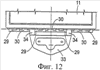 Шарнирное соединение между частью 10 и частью 11 описано более подробно ниже со ссылкой на фиг.2 и 8-10. Одна из указанных двух частей, образующих контейнер предлагаемого устройства для защиты от кражи (в показанном варианте выполнения это часть 11), образует четыре расположенных на расстоянии друг от друга гнезда 29, а часть 10 образует три расположенных на расстоянии друг от друга гнезда 30. Эти гнезда расположены так, что гнезда 30 могут входить в промежутки между гнездами 29. Гнезда совмещают и через них пропускают стержень 31, фиксируемый в этом положении перпендикулярно изогнутым концевым участком 32, который поворотом стержня размещают внутри части 11 рядом с ее краевой стенкой, как показано на фиг.10. Части 10 и 11 можно легко разъединить в месте шарнирного соединения, например, для того чтобы заменить часть 10, имеющую одну глубину, на часть 10, имеющий другую глубину, меньшую или большую, чтобы приспособить объем контейнера к размеру демонстрируемых в нем товаров.
