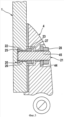 Распорно-крепежное средство 21 содержит палец 45 с резьбой, который имеет между своими концами круговой буртик 27, и гайку 28, при необходимости с подкладной шайбой 44. Обращенный наружу конец пальца 45 с резьбой снабжен внутренним многогранником 29, предпочтительно для приема шестигранного ключа.