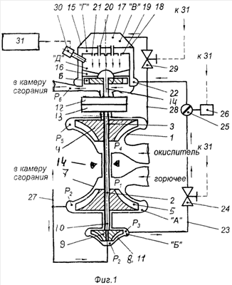 Выход из крыльчатки насоса окислителя 4 трубопроводом окислителя 28 через клапан окислителя 29 соединен с полостью «В» газогенератора 15. На газогенераторе 15 установлены одно или несколько запальных устройств 30. Блок управления 31 соединен электрическими связями с запальными устройствами 30, клапаном высокого давления 24, клапаном окислителя 29 и приводом регулятора расхода 26.