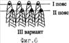 Следы струй на поверхности камеры сгорания показаны на фиг.4-6. На развертке приведены три варианта. В первом варианте (фиг.4) разноименные компоненты топлива подаются через форсунки, лежащие в одной плоскости. При этом след струи компонента второго пояса накладывается на след струи компонента первого пояса. Во втором варианте (фиг.5) разноименные компоненты топлива подаются через форсунки, лежащие каждая в своей плоскости и равномерно чередующиеся по окружности. Следы струй компонентов параллельными потоками перемещаются в сторону сопла камеры ЖРДМТ. При этом, растекаясь по стенке камеры сгорания, струи смыкаются. В третьем варианте (фиг.6) форсунки окислителя и горючего размещены каждая в своей плоскости, но эти плоскости, а следовательно, и следы струй попарно приближены друг к другу. Следы струй компонента второго пояса частично накладываются на следы струй компонента первого пояса.