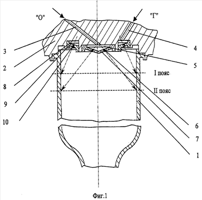 На фиг.1 условно показано два пояса: I пояс – уровень падения струй горючего на стенку камеры сгорания, II пояс – уровень падения струй окислителя на стенку камеры сгорания. Струйные форсунки 6 и 10 окислителя и горючего направлены под острым углом к стенке камеры сгорания 1, лежат в радиальных плоскостях и в объеме камеры сгорания не пересекаются.