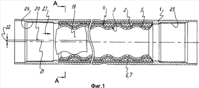Максимальная толщина 14 обкладки 5 из эластомера, которая расположена внутри трубчатой оболочки 2 и скреплена с ее внутренними винтовыми зубьями 3, вдоль впадин 15 винтовых зубьев, расположенных на максимальном радиальном удалении, равна половине высоты 16 внутренних винтовых зубьев 17 обкладки 5 из эластомера (показано на фиг.2).